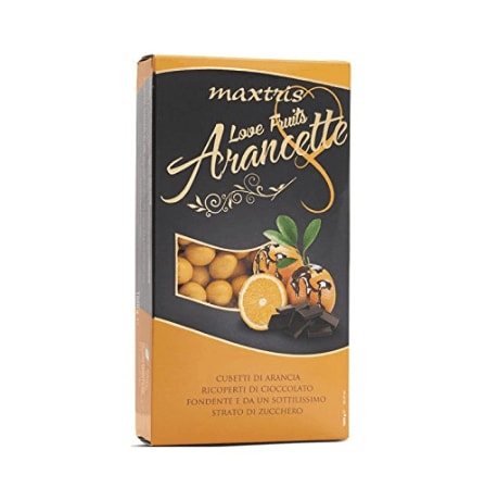 Boite de dragées Italiennes d’un kilo. Ces dragées sont faites à partir d’une orange confite enveloppées d’un couche de chocolat noir et d’une pellicule de sucre.