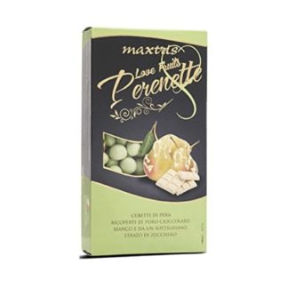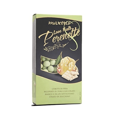 Boite de dragées Italiennes d’un kilo. Ces dragées sont faites à partir de poire confite enveloppées d’un couche de chocolat noir et d’une pellicule de sucre.