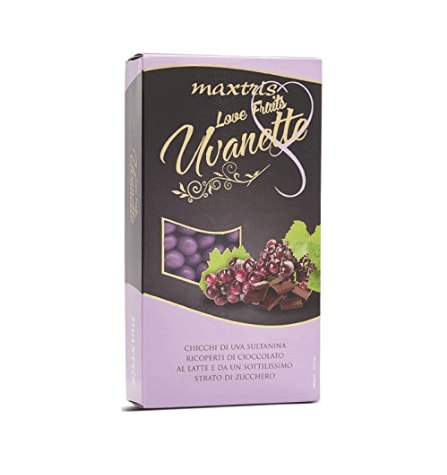 Boite de dragées Italiennes d’un kilo. Ces dragées sont faites à partir d’un raison confit enveloppées d’un couche de chocolat noir et d’une pellicule de sucre.